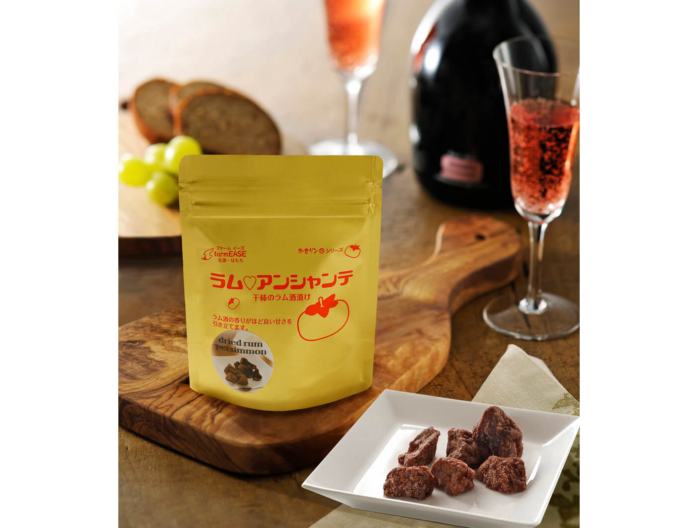 ラム酒の香りが干柿のほどよい甘さを引き立て、後を引く美味しさです。